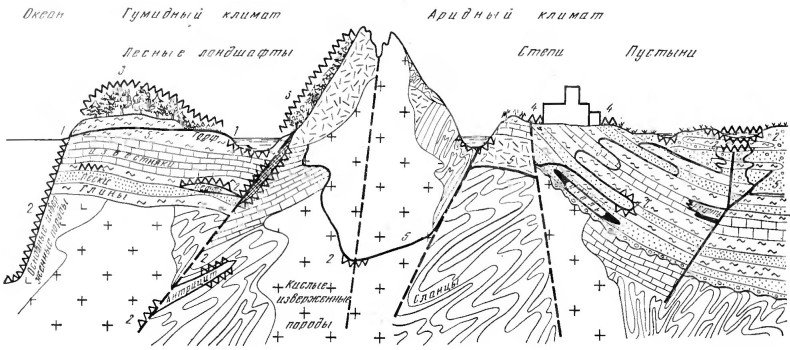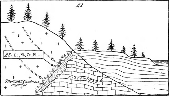 1 — ультраосновные породы; 2 — известняки; 3 — кислые воды; 4 — щелочной барьер (Д)