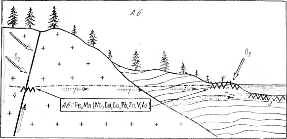 1 — кислые глеевые воды. Кислородные барьеры: 2 — у основания склона; 3 — на дне озера; 4 — в зоне разлома