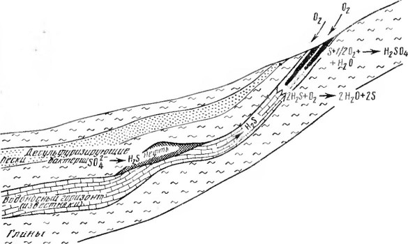 Рис. 31. Схема формирования месторождения самородной серы в местах длительной разгрузки сероводородных вод (A11)