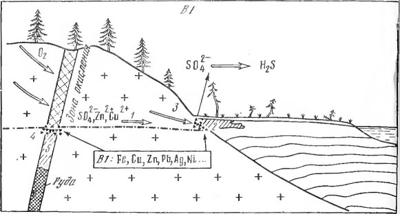 Если на возвышенности располагаются рудные тела, содержащие сульфиды железа, никеля, кобальта, меди и других металлов, то окисление этих руд приводит к образованию сернокислых грунтовых вод, обогащенных металлами. Двигаясь в сторону депрессий рельефа, такие воды встречают торфяное болото у подножия склона, где бактерии восстанавливают SO42- с образованием Н2S. В результате в краевой зоне болота возникает сероводородный барьер, на котором концентрируются принесенные металлы. Так образуется геохимическая аномалия В1, оторванная от оруденения, которая служит важным поисковым признаком месторождений (рис. 32). Эти явления были изучены в районе медно-никелевых месторождений Кольского полуострова.