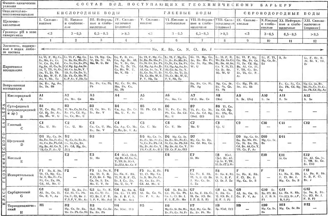 Кислородные и глеевые воды могут различаться по окислительно-восстановительным условиям, т. е. возможны слабоокислительные и резкоокислительные воды, слабоглеевые и резкоглеевые и т. д. Отсюда следует, что из слабоглеевых вод возможно осаждение элементов на глеевом барьере (с резкоглеевой средой). Эта комбинация и отмечена в табл. 6 (C5—C8). Из кислородных вод также возможны концентрации элементов на кислородном барьере (А1—А4).