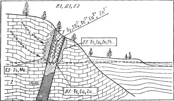 Во многих озерных, морских и океанических илах, а также в морских осадочных породах встречаются сульфиды железа (пирит) и реже других металлов. Это позволяет утверждать, что в илах существовал сероводородный барьер, на котором из слабощелочной, морской или иловой воды осаждались металлы (тип В3, отчасти В7). Напомним, что особенно энергично эти процессы протекали в конце рифея в так называемую вендскую эпоху и в начале палеозоя — в кембрии, ордовике, силуре (680—410 млн. лет назад). Именно в это время во многих морях шло накопление илов, обогащенных сульфидами металлов.
