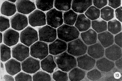 13. ЯЧЕЙКИ ДЛЯ РАБОЧИХ ПЧЕЛ РЯДОМ С БОЛЬШИМИ ПО РАЗМЕРУ ЯЧЕЙКАМИ ДЛЯ ТРУТНЕЙ (ПЧЕЛЫ РЕШАЮТ ЗАДАЧУ СОЕДИНЕНИЯ РАЗНЫХ ПО РАЗМЕРУ ЯЧЕЕК, СООРУЖАЯ НЕСКОЛЬКО ЯЧЕЕК НЕПРАВИЛЬНОЙ ФОРМЫ).