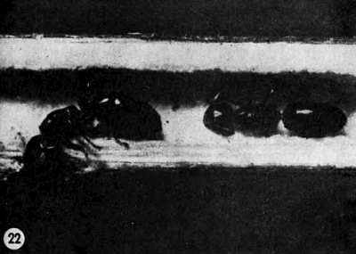 23. ОДИН МУРАВЕЙ ПРИБЛИЖАЕТСЯ К ВХОДУ; ВИДНА ГОЛОВА ВТОРОГО, КОТОРЫЙ ПРЕГРАЖДАЕТ ВХОД.
