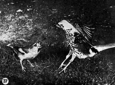 37. ДУБОНОС (COCCOTHRAUSTES COCCOTHRAUSTES)J НАПАДАЕТ НА ДРОЗДА-ДЕРЯБУ (TURDUS VISCIVORIUS).