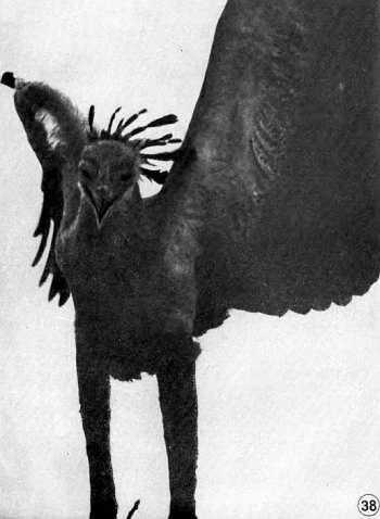 38. ПТИЦА-СЕКРЕТАРЬ (SAGITTARIUS SERPENTARIUS), НАПАДАЯ НА ЗМЕЮ, ПРИБЛИЖАЕТСЯ К СВОЕЙ ЖЕРТВЕ, ПОДНЯВ ХОХОЛ И РАСПЛАСТАВ ЧЕРНЫЕ КРЫЛЬЯ.
