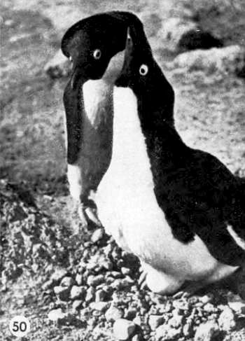 50. АНТАРКТИЧЕСКИЙ ПИНГВИН PYGOSCELIS ADELIAE ПРИБЛИЖАЕТСЯ К СИДЯЩЕЙ НА ЯЙЦЕ САМКЕ, ЧТОБЫ СМЕНИТЬ ЕЕ.
