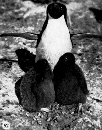 52. САМКА АДЕЛИЙСКОГО ПИНГВИНА, РАСКРЫВ КРЫЛЬЯ, ОХРАНЯЕТ ТОЛЬКО ЧТО ВЫЛУПИВШЕЕСЯ ПОТОМСТВО.