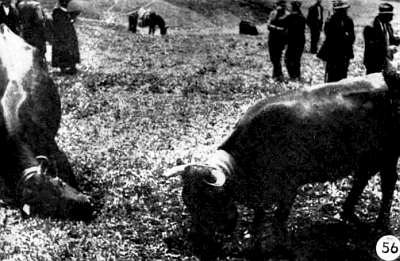 56. СЦЕНА НА ПАСТБИЩЕ В ШВЕЙЦАРИИ: КОРОВА СЛЕВА, ГОТОВЯСЬ К АТАКЕ ТРЕТСЯ ГОЛОВОЙ О ЗЕМЛЮ, ЕЕ ПРОТИВНИЦА, ПО-ВИДИМОМУ, НЕ РАСПОЛОЖЕНА СРАЖАТЬСЯ.