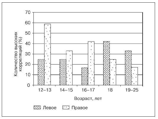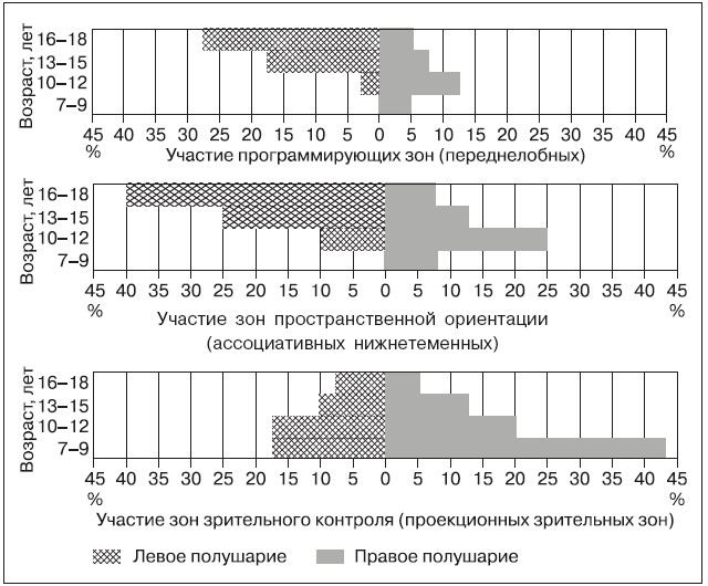 Рис. 56. Возрастная динамика участия разных зон левого и правого полушарий в управлении движениями