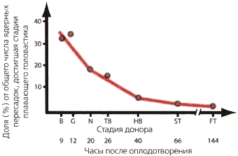Рис. 22.3. Выживаемотъ эмбрионов Xenopus, полученных в ре зультате пересадки ядер снижается номере того, как донорские ядра берутся из все более и более специализированных донорских клеток