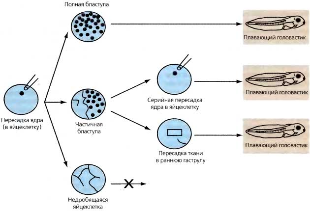 В опытах по трансплантации ядер у амфибии оказалось невозможным получить нормальное взрослое животное из ядра другой взрослой особи. Однако морфологически нормальные головастики были получены из ядер клеток многих различных тканей взрослых особей (Laskey and Gurdon, 1970), и эти головастики имели нормальный набор функционирующих специализированных типов клеток. Следовательно, клетки, коммитированные в направлении одного пути дифференцировки, содержат, тем не менее, генетический потенциал, обеспечивающий в комбинации с цитоплазмой яйца большинство неродственных типов клеточных дифференцировок.