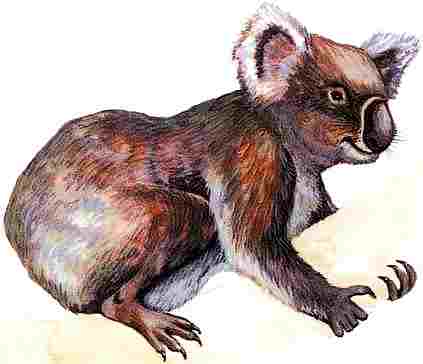 Отряд: сумчатые. Масса 17–18 кг, длина тела 60–80 см. Питается исключительно листьями 2–3 видов эвкалиптов и водится там, где они растут. Листья эвкалиптов содержат яд, видимо поэтому никто из хищников не охотится на коала — у этого симпатичного животного нет врагов среди зверей. У коала рождается один детеныш длиной около 15 мм и массой около 5 г. Он переползает в сумку. Через полгода вместо молока детеныш начинает получать… испражнения матери из полупереваренных листьев. В восемь месяцев он вылезает из сумки и поселяется на спине матери. Коала всю жизнь проводят на деревьях, они очень медлительны и спокойны, водятся только в Австралии и строго охраняются.
