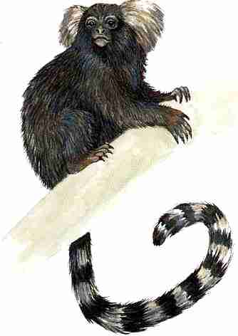 Отряд: приматы. Игрунки — самые маленькие обезьянки, их размер до 15 см, при длине хвоста около 20 см и массе около 250 г. Ногти у игрунки похожи на заостренные когти, поэтому этих обезьянок называют иногда когтистыми. На землю игрунки не спускаются, прыгают по веткам, как белки, отсюда еще одно их название — белкообразные обезьяны. Живут стайками, питаются растениями, насекомыми.