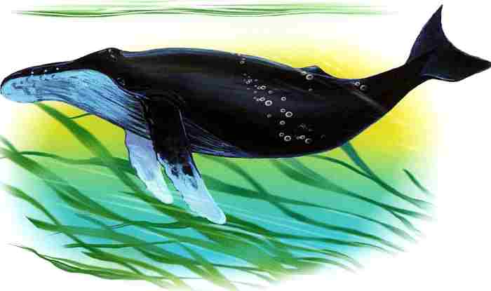Отряд: китообразные. Длина до 18 метров, грудные плавники — до 1/3 длины тела, спинной — толстый, низкий, в виде горба. Живут эти киты стадами, поедают рачков, множество мелкой рыбы. Рождается один детеныш длиной около пяти метров. Киты-горбачи любят подплывать к кораблям и подолгу их сопровождают. Охотятся на косяки рыб коллективно, хором исполняют «китовые песни». Распространены от Арктики до Антарктики.