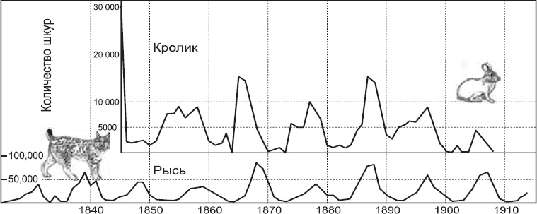 Лемминги оказались не единственной дичью, численность которой так сильно колебалась. Элтон обнаружил, что популяции канадского кролика (или американского беляка) изменяются таким же образом: резкие всплески численности примерно раз в 10 лет, а затем такие же резкие падения. Кролики – любимое лакомство канадской рыси. «Она живет кроликами, рыщет за кроликами, думает о кроликах, напоминает кролика на вкус, умножается вместе с кроликами, а когда их нет – гибнет от голода в обескроленных лесах», – писал один натуралист. При этом мех канадской рыси – излюбленная добыча трапперов из компании Hudson Bay. Оказалось, что компания вела тщательный учет количества шкур, заготовленных во все годы, начиная примерно с 1821-го. На графике эти цифры также выстраивались в явственные 10-летние циклы, коррелировавшие с увеличением численности кроликов (рис. 2.4).