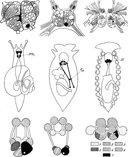 А — клетка ППа1 виноградной улитки (RPa1); Б — клетка П15 аплизии (R15); В — клетка № 22 тритонии. Показаны позиции нейронов в дорзальной клеточной коре соответствующих ганглиев — правого париетального (А), абдоминального (Б) и правого цереброплеврального (В) (верхний ряд рисунков). Показаны позиции названных ганглиев в теле соответствующего моллюска (средний ряд) и эволюционное происхождение разных частей ЦНС(нижний ряд). Все три клетки расположены в гомологичных участках нервной системы. Обозначения происхождения областей ЦНС для нижнего ряда рисунков: 1 — педальное, 2 — паллиальное, 3 — церебральное, 4 — субинтестинальное, 5 — плевральное, 6 — висцеральное, 7 — супраинтестинальное.