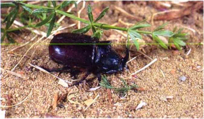Внешние признаки. Совершенно необычно выглядит самец — это действительно настоящий носорог. На голове у него расположен огромный выступ — загнутый назад острый рог с угловатыми краями, а на верхней поверхности груди — тупой массивный выступ. Наверно, всякой «насекомой мелочи» он и на самом деле кажется носорогом: ведь жук порой достигает огромного для насекомых размера — 4 с лишним сантиметров. Необычный облик жука издавна привлек к нему внимание: он повсюду хорошо известен. Немногие насекомые удостоены чести оставить след в народном фольклоре. В. Даль приводит в своем «Толковом словаре» загадку: «Черный ворон с рогом, а не бык, о шести ног без копыт?»