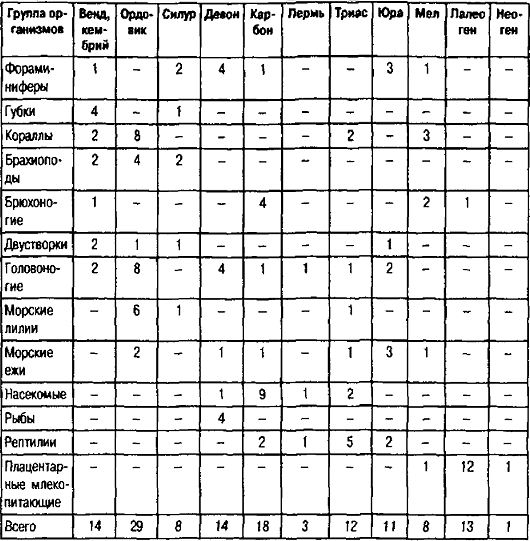 Красилов (1987) справедливо считает, что планетарные экосистемные события распознаются с большей объективностью по смене или вымиранию доминирующих видов в наиболее обширных сообществах. В приводимой им табл. 5 указаны геохронологические рубежи, выделенные по этому показателю и признаваемые большинством исследователей наиболее резкими.