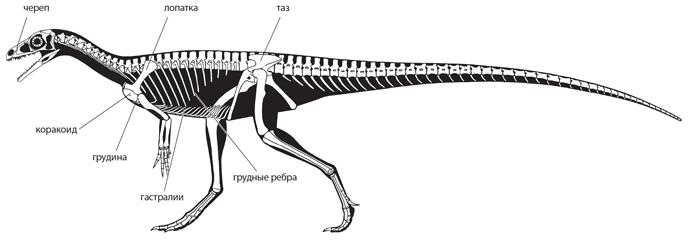Черепа и зубы динозавров представляют особый интерес для ученых, ведь именно они несут массу информации о питании, поведении и образе жизни. Но череп – это только часть скелета, причем меньшая. Большая часть скелета называется посткраниальным скелетом, к нему относится все, кроме черепа. Как у других четвероногих, у динозавров есть парные конечности и пояса конечностей в передней и задней части тела. Пояс передних конечностей называется скапулокоракоид, или плечевой пояс. Он состоит из лопатки и пластинчатой кости, которая называется коракоид.