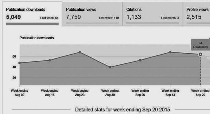 Рис. 61. Диаграмма с профессионального информационного сайта Research Gate, который информирует авторов, какой спрос имеют их статьи в научном сообществе. Данные на диаграмме – за последние два года, с середины 2013 года. Первое число показывает, сколько раз мои статьи «скачали», второе – сколько раз их просмотрели, третье – сколько раз за последние два года процитировали в других научных публикациях, и последнее – сколько раз поинтересовались моим профессиональным описанием.