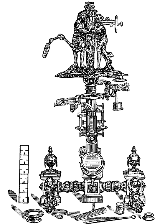 Микроскоп явился развлечением для скучающих обитателей замков, дворцов, да и бюргерских домов, и рынок со свойственной ему сообразительностью учел это. Каких только микроскопов не делали в первой половине XVIII в.! Картонные микроскопы нюрнбергских мастеров, салонные микроскопы, украшенные причудливой резьбой и фигурами амуров, микроскопы в стиле «рококо», «мушенброковы орехи», прочие сооружения, дешевые и дорогие, но почти всегда с плохими линзами и годные только для развлечения. Их были сотни, этих «любителей», проводивших часы досуга с микроскопом, и некоторые из них, выросшие из простых любителей, в энтузиастов, оказали немалые услуги и «микрологии» и зоологии вообще.