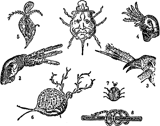 1 — клещ (Жобло, 1718); 2–4 — голова блохи (Ледермюллер, 1761); 5–6 — ветвистоусый рачок (Эйхгорн, 1781); 7 — водяной клещ (Эйхгорн, 1781); 8 — малощетинковый червь (Рёзель, 1755).
