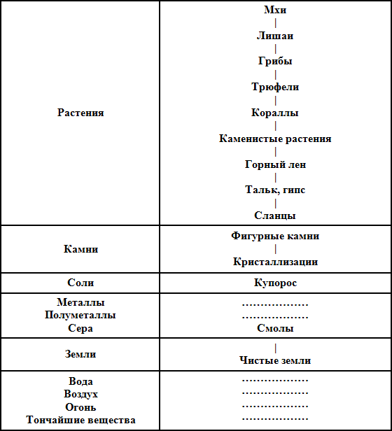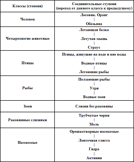 Самая «лестница» была построена местами на основании образа жизни животных или на чисто внешних их признаках. Так, человек, через оранга и обезьян соединялся с четвероногими, а эти соединены с птицами через белку-летягу, летучую мышь и страуса. Эта переходная ступень до смешного напоминает «птиц средней природы» Альдрованди. Птицы через водных птиц и летающих рыб связаны с рыбами, а эти через ползающих рыб, угрей и водяных змей — с змеями. Голые слизни и улитки соединяют змей с раковинными слизняками, а эти связаны с насекомыми посредством червей-трубчатников и бабочек-молей (ведь гусеницы некоторых молей строят трубочки-чехлики; Боннэ забыл о ручейниках — вот была бы эффектная «связь»). Между насекомыми и растениями — ряд «переходов»: здесь и орешкотворные насекомые (орехотворки), попавшие в число переходов, очевидно, потому, что когда-то предполагали самозарождение орехотворок из галлов, так как иных оснований для их «переходности» не придумаешь; здесь и ленточные черви и, конечно, гидра и актинии. Но кораллы попали в число переходов между растениями и минералами наравне с «горным льном» (асбест) и каменистыми растениями.