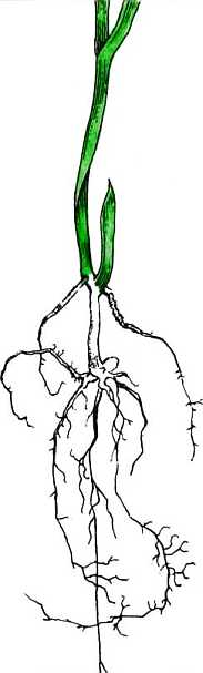 Корни пшеницы: в нижнем ярусе зародышевые, или первичные, в верхнем — узловые, или вторичные.