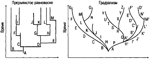 Идея прерывистого равновесия возникла как альтернатива градуалистической модели эволюции, идеально воплощенной в теории Дарвина. В XX в, оплотом градуализма традиционно оставались классическая популяционная генетика и, соответственно, синтетическая теория. На позициях градуализма до сравнительно недавнего времени стояли и молодые палеонтологи.