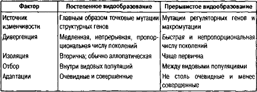 Таблица 2. Сравнение гипотез постепенного и прерывистого видообразования