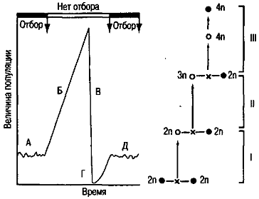 Карсон (Carson, 1975, 1978) разработал оригинальную теорию («founder-flush-theory») чрезвычайно быстрого видообразования, опираясь на принцип основателя и генетический дрейф. По этой теории видовые популяции последовательно переживают состояния взрыва («flush»), когда внезапно возникает много особей, и крушения («crash»), когда большинство их гибнет. Единичные выжившие демы в предельном случае могут состоять из одного индивида-основателя, претерпевшего вынужденную генетическую реорганизацию. Это так называемый диахронный эффект бутылочного горлышка. По Карсону, он составляет сущность процесса видообразования (Carson, 1975. Р. 88) (рис. 25). Стэнли трактует этот способ как «потенциальный механизм ускорения филетической эволюции», родственный действию катастрофического отбора, и на этом основании (ввиду «чрезвычайной редкости») фактически его отвергает (Stanley, 1979. Р. 98). Действительно, при данном способе увеличения числа видов не происходит, а факты длительного существования хроновидов заставляют признать его весьма ограниченную роль в макроэволюции. Стэнли отстаивает ключевую роль в макроэволюции очень малых популяций, оказавшихся просто изолированными от нормальных популяций предшествующих видов, что и следует считать типичным для гипотезы прерывистого равновесия. Вместе с тем он положительно относится к идее возникновения нового вида (например, у брюхоногих моллюсков) от единственной гермафродитной самки, испытавшей зародышевую мутацию.