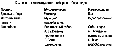 По Стэнли, при описании и объяснении макроэволюции можно провести полную аналогию с популяционными процессами. Механизм макроэволюции станет понятным, если особи заменить видами, события рождения и смерти — соответственно видообразованием и вымиранием, индивидуальную изменчивость (мутации и рекомбинации) — видообразованием, а естественный отбор — отбором видов. Агентами отбора видов выступают обычные ограничивающие экологические факторы — конкуренция, хищничество, изменения среды и случайные флуктуации в размерах популяций. Направляющими (неслучайными) компонентами отбора видов выступают дифференциальные темпы видообразования среди имеющихся линий, по-разному скоррелированные между собой. Сказанное Стэнли наглядно отображает следующая таблица.