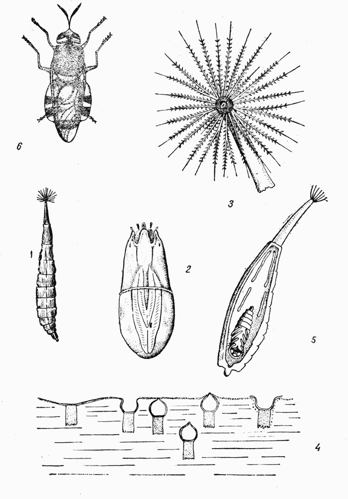 Таблица LIX. Муха львинка - Stratiomyia chamaeleon: Рис. 1. Личинка (по Гентшелю). - Рис. 2. Голова личинки. - Рис. 3. Розетка волосков на конце тела личинки (по Сваммердаму). - Рис. 4. Схема развертывания и свертывания хвостовых волосков. - Рис. 5. Куколка (по Сваммердаму). - Рис. 6. Взрослая муха львинка.