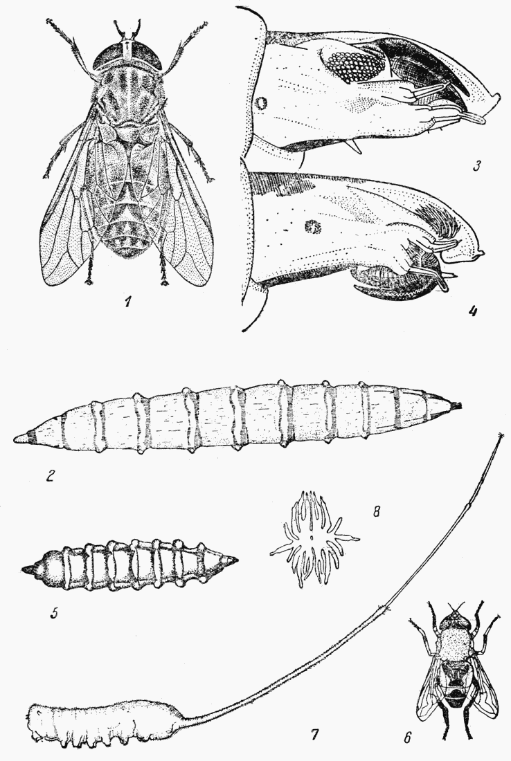 Таблица LX: Рис. 1. Слепень осенний (Tabanus autumnalis), самка (по Олсуфьеву). - Рис. 2. Личинка слепня осеннего (по Олсуфьеву). - Рис. 3. Голова личинки слепня, жвалы вытянуты (по Олсуфьеву). - Рис. 4. Голова слепня, жвалы в позе нападения (по Олсуфьеву). - Рис. 5. Личинка златоглазика (Chrysops) (по Грюнбергу). - Рис. 6. Пчеловидка (Eristalis). - Рис. 7. Крыска, личинка пчеловидки, - Рис. 8. Анальные жабры личинки пчеловидки (Eristalis tenax).