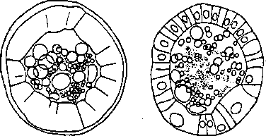 I. Sphaerechinus-тип. При оплодотворении яиц Strongylocentrotus lividus, Echinus microtuberculatus и Arbacia pustulosa — всех, каких только мог испробовать Бальцер, — спермой ежа Sphaerechinus granularis всегда как общее правило на самых ранних стадиях образования бластулы гибридные эмбрионы обнаруживали «заболевание» со следующими признаками. Как только начиналось образование бластоцеля, т. е. через 13–20 часов по оплодотворении, в полость бластоцеля начинали выходить многочисленные клетки. В это время эмбрионы находятся еще в оболочке, и нормальное образование мезенхимы, сопровождающееся тоже проникновением клеток в бластоцель, начинается лишь гораздо позднее, часов через 24–26 по оплодотворении. Таким образом описываемое раннее внедрение клеток в бластоцель не имеет никакого отношения к нормальному процессу образования мезенхимы. Чем больше становится бластоцель, тем гуще он набивается кучами клеток, подвергающихся частично распаду. Личинки становятся болезненными, непрозрачными и массами опускаются на дно. Рис. 46 представляет две таких больных бластулы в возрасте 12 часов и 25 часов после оплодотворения. На правом рисунке видны помимо целых и распадающихся клеток внутри бластоцеля еще патологические клетки с гигантскими ядрами в стенке бластулы.