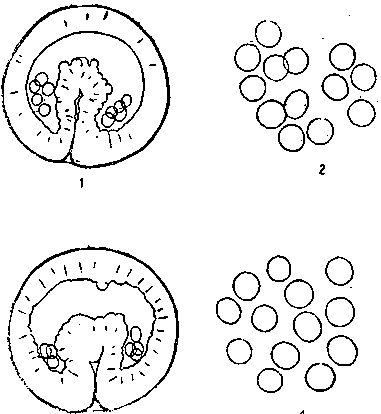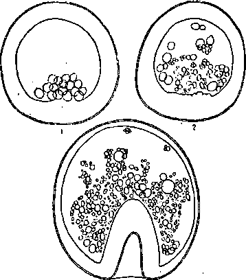 1 — гаструла гибрида, 2 — его ядра, 3 — для сравнения чистый Strongylocentrotus и его ядра (по Бальцеру).
