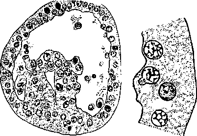 Во многих местах видны сплошь окрасившиеся ядра, а в нижней части левого рисунка видна довольно вероятная картина выбрасывания хроматиновых кусков из ядер. Правый рисунок представляет картину при большем увеличении.