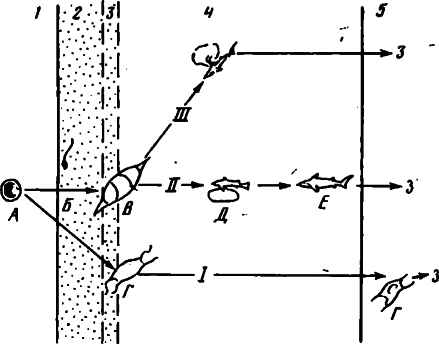 1 — яичник; 2 — яйцевод; 3 — скорлуповая железа; 4 — утерус; 5 — внешняя среда; А — яйцеклетка; Б — оплодотворение; В — яйцевая капсула в мягкой оболочке; Г — яйцевая капсула в роговидной оболочке; Д — эмбрион с желточным мешком; Е — эмбрион с рассосавшимся желточным мешком; З — рождение молоди; I — яйцекладущие; II — яйцеживородящие; III — живородящие акулы
