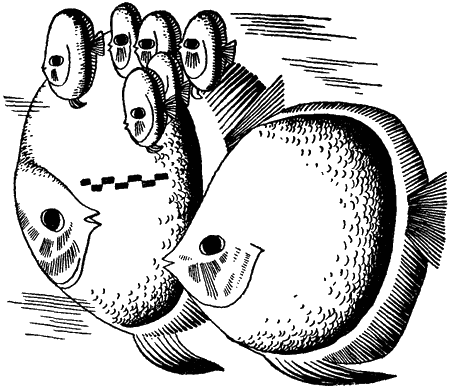 Есть фабрика-кухня и у рыб. Круглые, как блин, дискусы, живущие в Амазонке, выкармливают мальков желтоватой слизью собственного тела. Первые сутки только что вылупившиеся малыши лежат на листе какого-нибудь растения, а когда проголодаются, набрасываются на охраняющую их мать и объедают с ее тела всю слизь. Сытые крошки обратно на лист больше не возвращаются. Прикрепившись к остаткам слизи, они повисают гроздьями на спине и боках своей матери и с комфортом путешествуют в подводном царстве. Когда же наступает время следующей кормежки, самка зовет на помощь самца и стряхивает ему на спину проголодавшихся детей. Так по очереди, сменяя друг друга, выкармливают заботливые родители свое многочисленное потомство, и только много позже мальки начинают питаться самостоятельно.