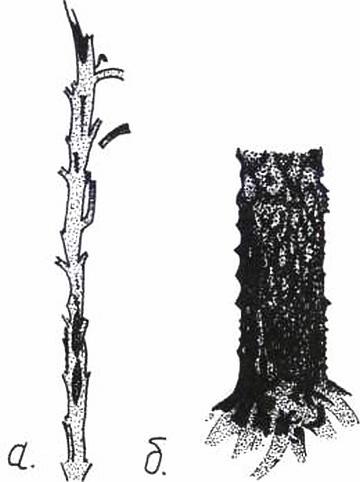 Рис. 16. Отпечатки проблематичных организмов, напоминающие остатки высших растений: а — Boiophyton (бойофитон) и б — Aldonophyton (алданофитон). По Мейену.