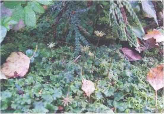 Фото 39. Печёночный мох Morshantio geteromorpho (Маршанция многообразная). Хорошо видны высокие женские подставки — выросты слоевища, на которых находятся женские половые органы. Подмосковье.