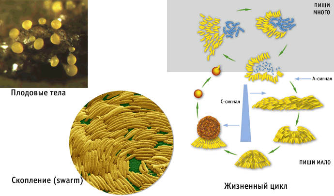 При недостатке пищи миксококки образуют плодовые тела, в которых часть бактерий превращается в споры. В виде спор микробы могут пережить голодные времена. Плодовое тело «собирается» из огромного множества индивидуальных бактериальных клеток. Создание такой сложной многоклеточной структуры требует слаженных действий миллионов отдельных бактерий, из которых лишь часть получает прямую выгоду, а остальные жертвуют собой ради общего блага. Дело в том, что лишь некоторые из участников коллективного действа смогут превратиться в споры и передать свои гены следующим поколениям. Все остальные выступают в роли «стройматериала», обреченного умереть, не оставив потомства.