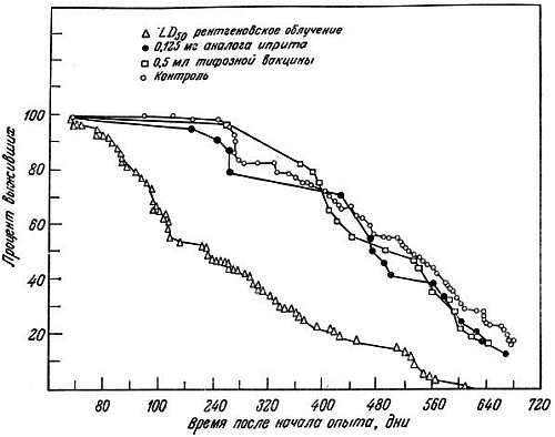 Уменьшение продолжительности жизни под влиянием облучения наблюдали у мыши [13, 14, 72], человека [110] и дрозофилы [3, 28, 69, 83]. Популяция дрозофилы, подвергнутая облучению дозой около 4500 рад, фактически живет дольше, чем контрольная [119]. Такой же результат получен на безмикробных мышах [127]. Симптомы, появляющиеся у облученных особей со сниженной продолжительностью жизни, отличаются от тех, которые возникают во время естественного старения без облучения. Следовательно, проникающая радиация не ускоряет процесс естественного старения, но вызывает раннюю смерть из-за повышения частоты рака или других болезней. Таким образом, укорочение жизни, вызванное ионизирующей радиацией, может представлять собой неспецифический эффект и быть следствием "радиационного синдрома", который не связан с естественным старением.
