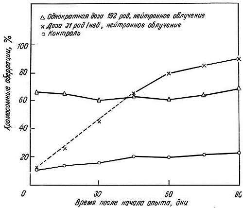 Рис. 9.2. Сравнение эффекта нейтронного облучения на число хромосомных аберраций в клетках печени мышей и их возрастных изменений [22]. При однократном облучении дозой 192 рад аберрации наблюдаются в среднем) в 56 % клеток (треугольники)