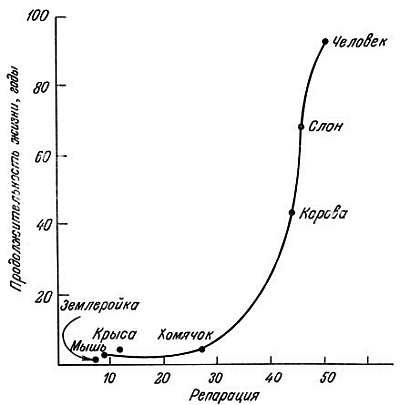 В связи с этим встает вопрос о скорости репродукции, или плодовитости, о продолжительности репродуктивного периода и о продолжительности жизни после достижения половой зрелости. Мелкие млекопитающие типа грызунов, которые обладают высокой плодовитостью, имеют короткую репродуктивную фазу, а также укороченный пострепродуктивный период по сравнению с такими крупными млекопитающими, как слон, лошадь, домашний рогатый скот и человек, у которых скорость воспроизводства много ниже. Вероятно, чем быстрее воспроизводство, тем быстрее потеря определенных важных факторов и тем быстрее развитие разрушительных изменений. Однако черепахи откладывают много яиц, но тем не менее долго живут [116]. Матки общественных насекомых, пчел и термитов, которые отличаются большой плодовитостью, также имеют большую продолжительность жизни.