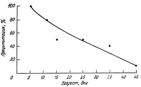 Рис. 9.4. Зависимость общей активности изоцитрат-лиазы, преципитированной данным количеством антител, от возраста круглого червя Tyrbatrix aceti [100]