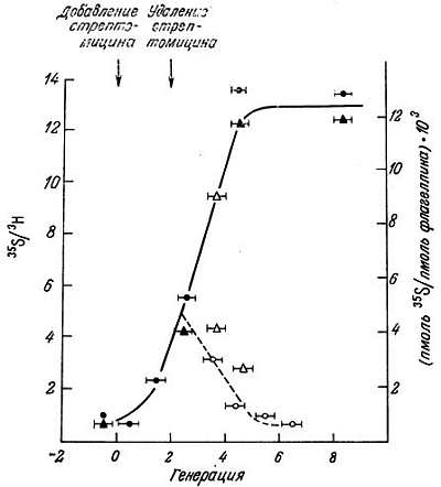 Рис. 9.5. Кинетика частоты ошибки в присутствии и в отсутствие стрептомицина [24]. Культура АС92 была выращена в отсутствие стрептомицина, и в ней была измерена частота фоновой ошибки. В момент, отмеченный стрелкой, добавляли 5 мкг/мл стрептомицина и измеряли частоту ошибки на протяжении более чем восьми последующих генераций. После двух генераций в присутствии стрептомицина из культуры отбирали аликвоту, отмывали минимальной средой без добавок для удаления стрептомицина и ресуспендировали в среде с добавками. Снова вычисляли частоту ошибки. Культуру метили 3Н-аланином (53 Ки/ммоль) и 35S-сульфатом (2 мКд/нмоль) и выделяли флагеллин, как описано ранее [24]. Сплошная линия и темные значки — частота ошибок в клетках, растущих в присутствии стрептомицина; штриховая линия и светлые значки — частота ошибок в клетках после удаления стрептомицина; светлые и темные кружки и треугольники обозначают данные, полученные в двух экспериментах. Длина горизонтальных линий на значках указывает на фракции той генерации, в пределах которой включалась метка