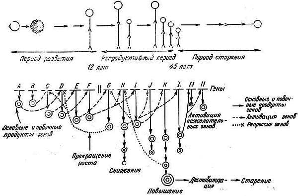 Каждый вид имеет уникальный набор генов, необходимых для развития и размножения. Их последовательная активация/репрессия, начиная с оплодотворения, определяет продолжительность периода развития и начало репродуктивного периода. Продолжительность репродуктивного периода зависит от способности организма возмещать утраченные факторы и (или) предупреждать накопление некоторых других факторов. Утрачиваемые факторы могут быть необходимы для поддержания определенных генов в активном состоянии, а других — в репрессированном. Факторы, которые накапливаются, могут инициировать некоторые нежелательные гены, например гены вирусов, или воздействовать на функцию других важных генов. Результатом дисбаланса факторов и модуляторов является потеря организмом репродуктивной и других функций, т. е. старение. Последней рассмотренной теорией не предусматриваются никакие уникальные гены, которые вызывают старение. Не предполагается также, что старение запрограммировано как развитие и размножение. Тогда как периоды развития и размножения находятся под контролем уникальных генов, которые активируются или репрессируются в определенное время, в соответствии с данной моделью никакие специальные гены в процессе старения не участвуют. Следовательно, старение нельзя считать запрограммированным событием, иначе нужно допустить существование специфических генов, предназначенных для этой цели и отобранных в ходе эволюции, которые активируются в определенное время после репродуктивного периода. Предполагают, что физиологическое старение — только следствие полового созревания, причем оно реализуется и в том случае, когда размножение не осуществляется. Преждевременное старение, как видно на примерах прогерии и синдрома Вернера, является патологическим и вызывается мутациями. Оно возникает вследствие дестабилизации гомеостатического контроля генов, функционирующих в репродуктивном периоде. Отсюда следует возможность продления репродуктивного периода путем улучшения функции генома, например возмещением утраченных факторов или удалением накопившихся вредных продуктов, и действительно, у млекопитающих в ходе эволюции отмечено постепенное увеличение продолжительности жизни, в частности репродуктивного периода. Это указывает на то, что происходил отбор в пользу видов с большей продолжительностью жизни и более длинным репродуктивным периодом. Следовательно, предположение об эволюции старения так же невероятно, как предположение о программировании старения по аналогии с периодами развития и размножения. Несомненно, старение сыграло в эволюции положительную роль, так как оно способствовало избавлению популяции от неразмножающихся особей, что создавало условия для размножения более молодых; тем самым оно благоприятствовало обновлению вида. Благодаря этому появлялись особи с новыми свойствами, более перспективными для отбора и эволюции.