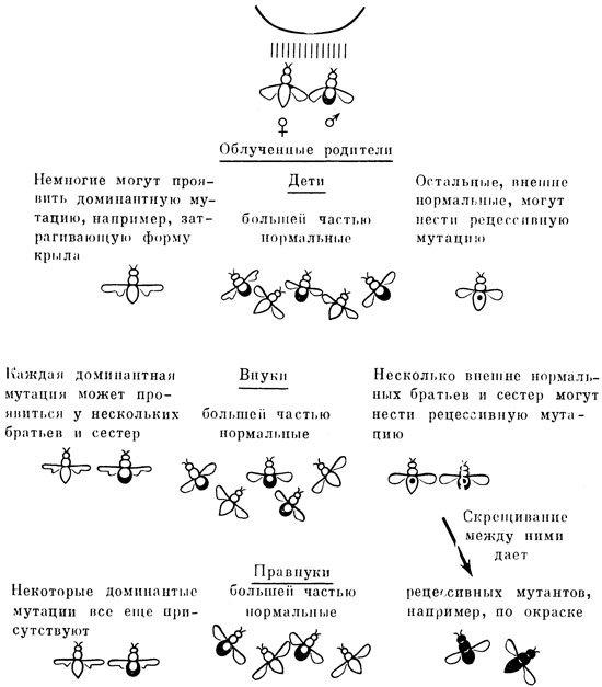 Рис. 10. Доминантные и рецессивные мутации в потомстве мушки дрозофилы, облученной рентгеновскими лучами. Черная точка на брюшке указывает на присутствие рецессивного мутантного гена